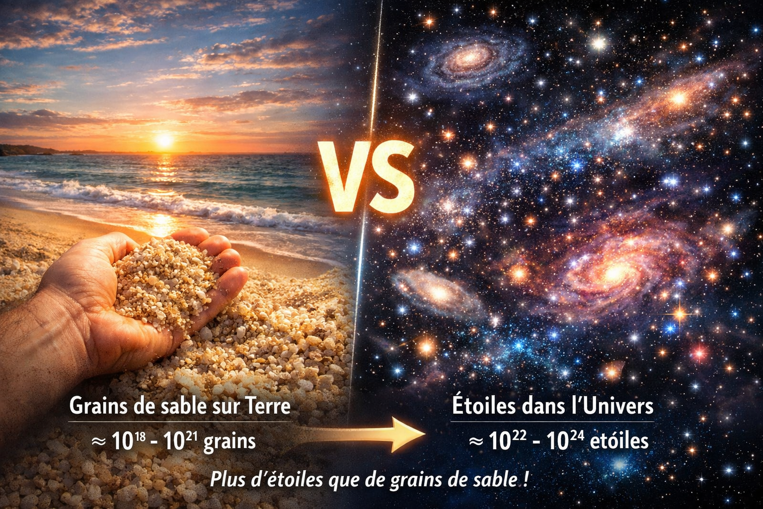Résultat : entre 10¹⁸ et 10²¹ grains de sable selon les méthodes utilisées.